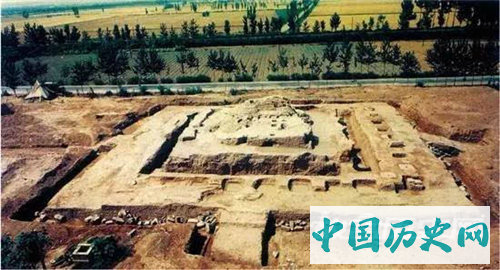 洛阳偃师商城遗址,平面略呈长方形,南北长1700余米,东西宽1215米~740米,包括大城、小城、宫城三重城垣。城址内发现有城门、道路、宫殿、居址等遗迹,并出土大量石器、陶器、铜器、玉器等遗物。