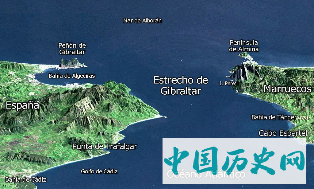 直布罗陀海峡,左侧是伊比利亚半岛(Espana),左上角是直布罗陀
