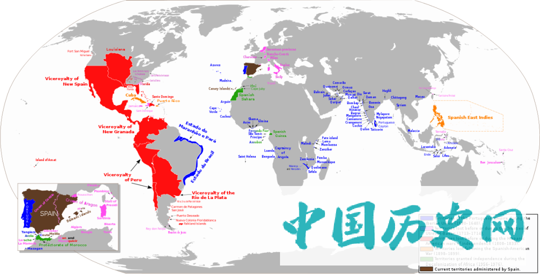 从哥伦布发现美洲后,西班牙先后占领了加勒比海岛屿、墨西哥,南美洲大部分。16、17世纪最辉煌的时候,西班牙在美洲有1800多万平方公里的殖民地。西班牙国王卡洛斯一世曾骄傲地说:”在朕的领土上,太阳永不落下。”西班牙成为世界上第一个“日不落帝国”